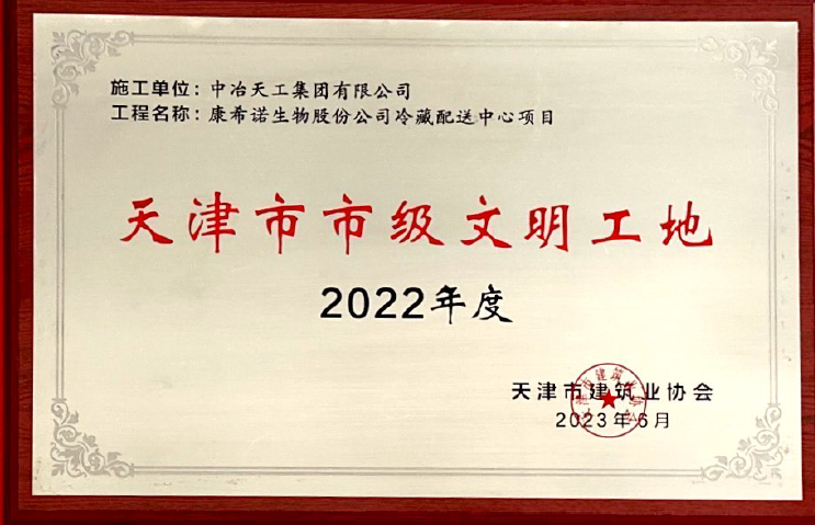 2023-118康希诺生物股份公司冷藏配送中心项目2022年度天津市市级文明工地(牌匾)